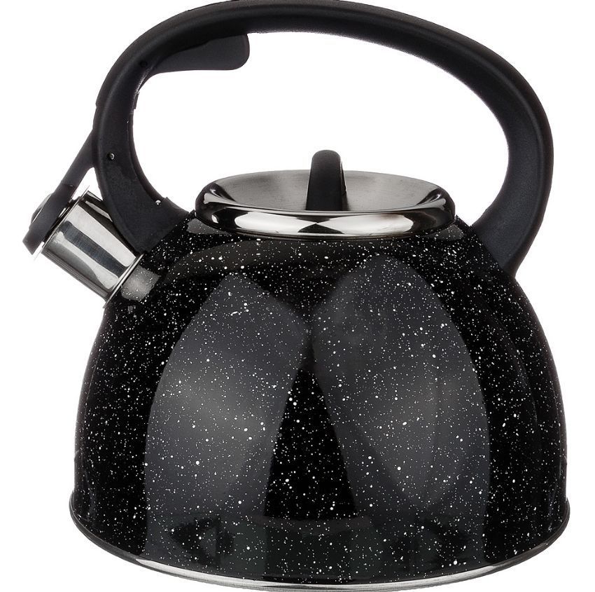 ЧАЙНИК AGNESS СО СВИСТКОМ "ЧЕРНЫЙ МРАМОР" 2,5 Л НЖС, ИНДУКЦИОН. ДНО Легко наливать воду. Используя клапан на ручке чайника, вы легко сможете налить воду. Просто нажмите на клапан, чтобы открыть носик чайника. • Встроенный свисток подскажет, что вода в чайнике закипела и его пора снимать с плиты. • Подходит для всех типов плит, включая Индукционные