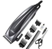 СЕТЕВАЯ МАШИНКА. Мощность 8 Вт. Регулируемая длина лезвия. 4 сменные насадки: 3, 6, 9 и 12 мм. Аксессуары: щеточка для чистки лезвия, расческа, масленка, ножницы.