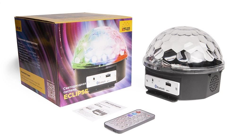 В52 "ECLIPSE" – эта комнатная светодиодная система для яркого праздника! 6 цветов свечения (зеленый/красный/синий/белый/желтый/розовый). 2 режима работы: автоматический и цветомузыка. Система компактная, не занимает много места. Ее можно расположить как на поверхности, так и закрепить на стене. Есть Bluetooth и USB разъем, что позволяет слушать любимую музыку и получать удовольствие от проекции. В комплекте пульт ДУ для удобного управления.