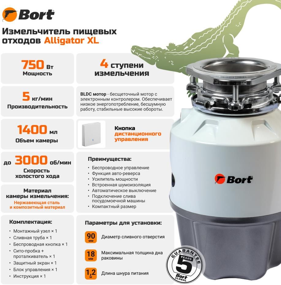 Brand: BORT Серия: ALLIGATOR Назначение: бытовой Число ступеней измельчения: 3 Функция авто-реверса: Да Усилитель мощности (бустер): Да Система шумоизоляции: полная Мощность, Вт: 750 Объем камеры, мл: 1 400 Материал корпуса камеры: Прочный композитный материал Материал измельчающего элемента: Нержавеющая сталь Тихий запуск: Да Система защиты от перегрузки и заклинивания: Да Скорость холостого хода, об/мин: 1 500...3 000 Вес изделия, кг: 6 Напряжение сети, В: 220 Частота тока, Гц: 50 Тип мотора: индукционный Мощность л.с.: 1 Производительность, кг/мин: 5 диаметр сливного отверстия: 3 1/2" (90мм) Толщина дна раковины, мм: 1...18 Уровень шума, дБ: 50 Автоматическое выключение: Да Длина шнура питания, м: 1,2 Бесшумная работа: Да Размер, мм: 252х184 Способ загрузки: непрерывный Подключение к посудомоечной машине: Да Возможность подключения беспроводной кнопки: Да Управление измельчителем: Электронное Тип соединения устройств, тип: Беспроводное Плавный пуск: Да