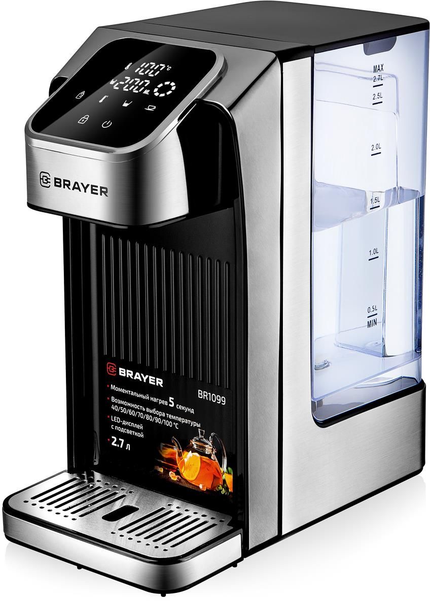 Мощность 2600 Вт Съёмный резервуар для воды объёмом 2.7 л LED-дисплей с подсветкой Сенсорное управление Возможность выбора температуры 40/45/50/60/70/80/90/100 °С Моментальный нагрев 5 секунд Блокировка подачи воды Корпус из нержавеющей стали Съёмный поддон для капель Отключение при отсутствии воды Защита от перегрева Электропитание 220-240 В, ~ 50-60 Гц
