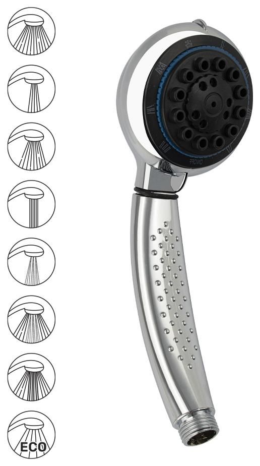 Душевая лейка отличается современным технологичным дизайном, высокой надежностью, долговечностью. Она изготовлена из влагостойкого пластика АБС и имеет декоративное покрытие цвета «хром», придающее устройству привлекательный вид и предохраняющее от агрессивного воздействия окружающей среды. Корпус отличается небольшим весом, что исключает повреждение напольной плитки или эмали ванны при случайном падении. Работает в 8 режимах с регулируемой интенсивностью: дождевая, обычная, струйный массаж и т.д. Ухаживать за душевой лейкой легко. Глянцевую поверхность достаточно протереть мягкой салфеткой, она в течение долгого времени не потеряет своего блеска. Система помогает мгновенно очистить силиконовые форсунки душевой лейки от известкового налета и загрязнения. Габаритные размеры: высота 200 мм, диаметр лейки 80 мм, диаметр корпуса 35 мм. Вес - 0,300 кг, объём - 0,00141 м3.
