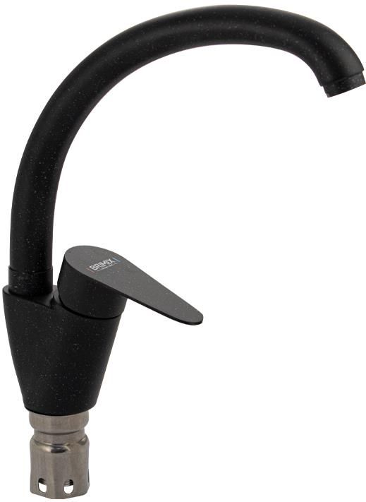 Смеситель для кухонной мойки и раковин, боковой, шаровый, корпус комбинированный, чёрная матовая эмаль с вкраплениями и с хромом, с высоким С-образным изливом, Материал изготовления — нержавеющая сталь. Крепление резьба - гайка, картридж d = 40 мм, ручка с прорезью. Аэратор для экономии воды. Габаритные размеры: высота 280 мм, длина 250 мм, диаметр посадочного седла 50 мм, длина резьбы 55 мм, длина подводки 500 мм. Вес - 1,100 кг, объём - 0,00420 м3. В комплекте паспорт, корпус с изливом, подводка 1/2, крепеж, набор прокладок.