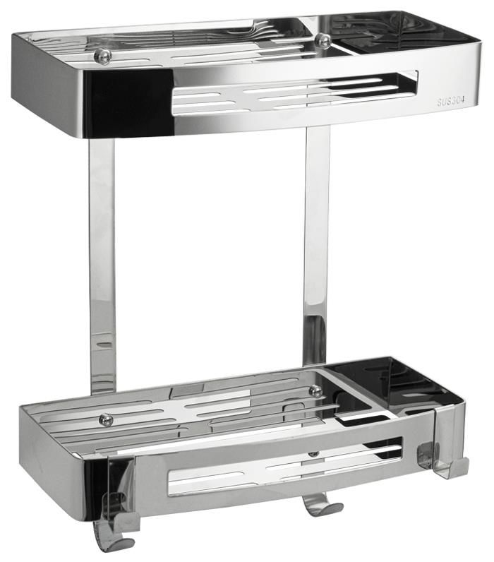 Полочка для принадлежностей, прямоугольная, с литым дном, двухэтажная, с двумя крючками, обладает высокими эксплуатационными характеристиками и подходит для использования дома, в общественных местах: отелях, ресторанах и пр. Изготовлена из прочной нержавеющей стали с хромоникелевым покрытием, которое придает безупречный глянцевый блеск и долговечность. Аксессуар не занимает много места, надежно фиксируется к стене при помощи набора креплений (входят в комплект) и служит удобным местом для хранения бытовых и косметических средств. Габаритные размеры: высота 370 мм, ширина 370 мм, глубина 130 мм, расстояние между полками 215 мм. Вес - 1,750 кг, объём - 0,00580 м3.
