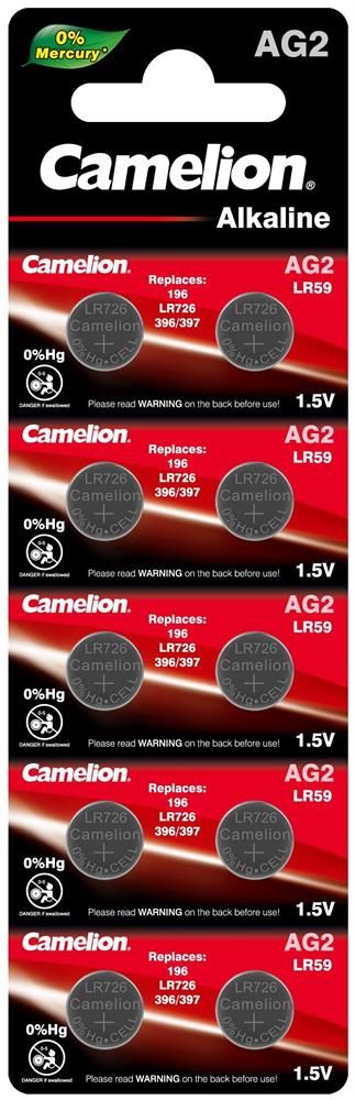 Батарейка алкалиновая Camelion G 2 BL-10 Mercury Free (AG2-BP10(0%Hg), 396A/LR726/196 батарейка для часов), напряжение 1,5В, емкость 25мА*ч, кол-во в упаковке 10 шт., размер упаковки 50x160x5 мм, использовать при температуре от -18 до +55 °C, хранить при температуре от + 15 до + 25 °C. Срок хранения 5 лет.