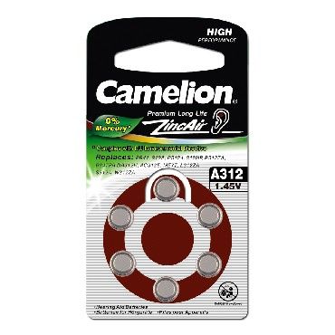 Батарейка Camelion ZA312 BL-6 Mercury Free (A312-BP6(0%Hg), батарейка для слуховых аппаратов, 1.4 V,170mAh), напряжение 1,4В, емкость 160мА*ч, кол-во в упаковке 6 шт., размер упаковки 40x90x4 мм, использовать при температуре от 0 до + 50 °C, хранить при температуре от +15 до +25 °C. Срок хранения 3 года.