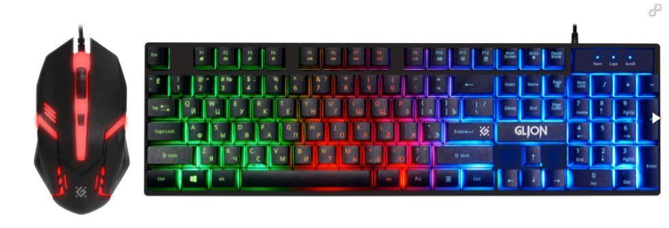 Набор игровой (клавиатура+мышь) проводной, интерфейс USB; клавиатура - количество клавиш 104 шт., горячие клавиши для быстрого доступа к офисным, мультимедийным и интернет приложениям, радужная подсветка, длина кабеля - 1,5 м; мышь - оптическая, количество кнопок - 3 , колесо прокрутки, изменяемое разрешение 800/1600 dpi, длина кабеля - 1,5 м.