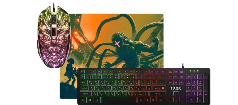 Набор игровой 3в1 (клавиатура+мышь+коврик) проводной, интерфейс USB; клавиатура - количество клавиш 104 шт.,ударопрочная конструкция , подсветка символов и клавиш; мышь - оптическая, количество кнопок - 3 , колесо прокрутки, изменяемое разрешение 800/1200/1600/2400 dpi, переливающаяся подсветка, длина кабеля - 1,5 м.; игоровой коврик - материал термически обработанная ткань + натуральная резина, поверхность - Speed, размер - 280х230х3 мм.