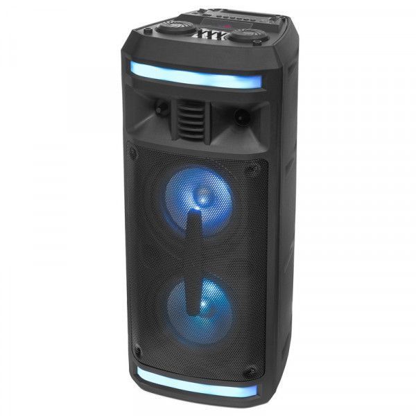 Портативная акустическая система c караоке, Bluetooth, microSD, USB и FM радио. Один микрофонный вход jack (6,35 мм, 1/4"), проводной микрофон в комплекте. Мощность системы RMS (Вт): 30. Сопротивление (Ом): 3. Частотный диапазон (Гц-КГц): 20-20. Гармонические искажения: