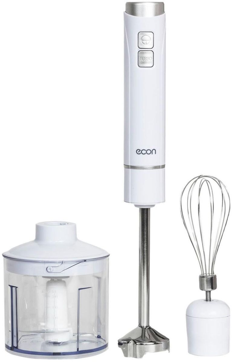 Блендер погружной, максимальная мощность 800 Вт, компактый размер - диаметр корпуса 42 мм, 2 скорости, насадка-блендер из нержавеющей стали, съемная насадка-венчик из нержавеющей стали, мини-измельчитель 500 мл, цвет белый с черным