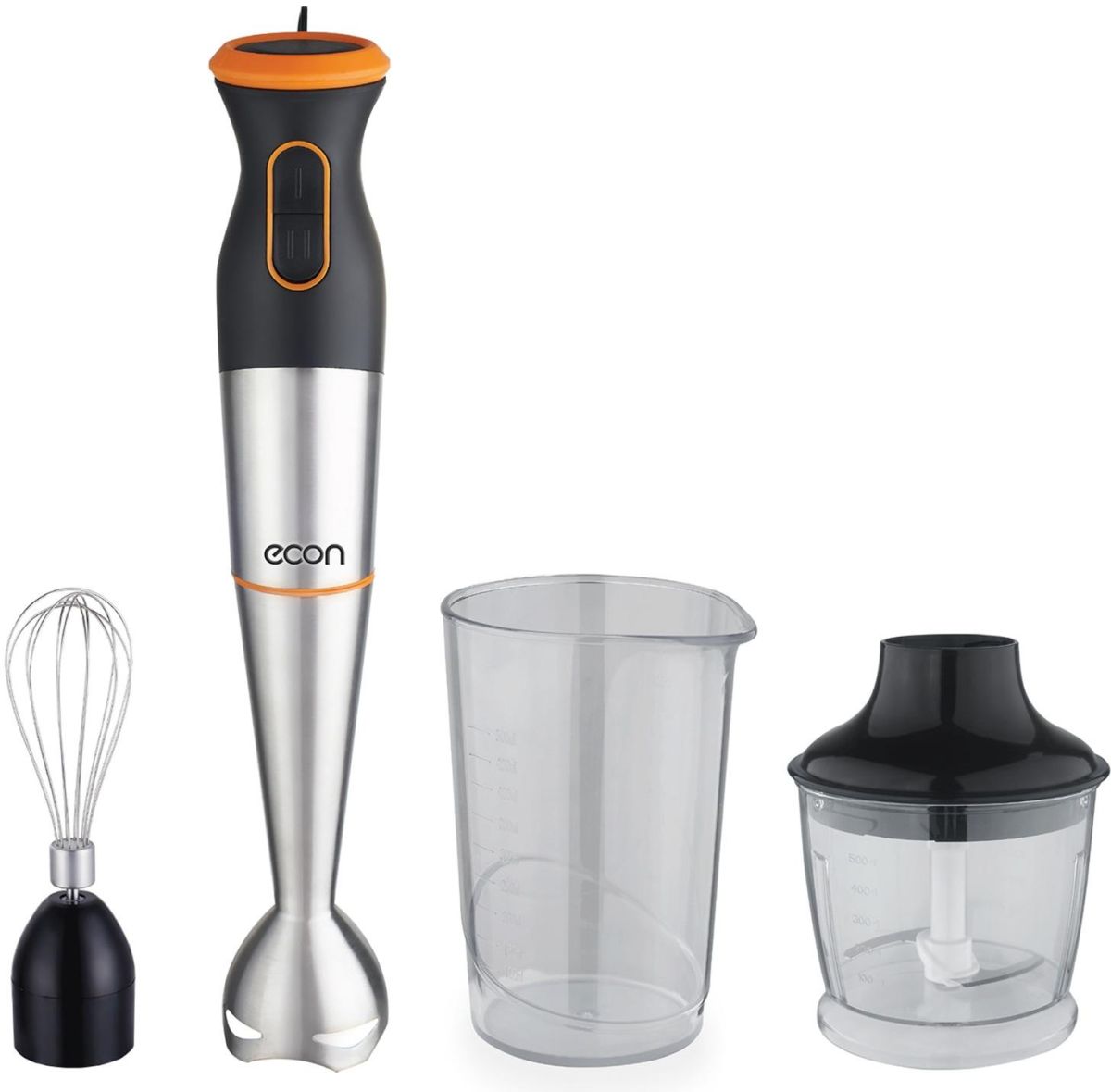 Блендер погружной, максимальная мощность 1000 Вт, импульсный режим работы, 2 скорости, насадка-блендер из нержавеющей стали, съемная насадка-венчик из нержавеющей стали, мини-измельчитель 500 мл, мерный стакан 500 мл, цвет черный со стальным