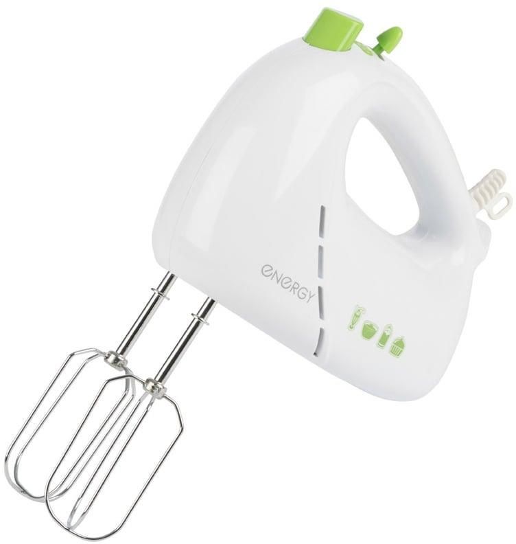 Мощность 200Вт. 5 скоростей работы. Стальные хромированные венчики для взбивания и насадки для замешивания теста.