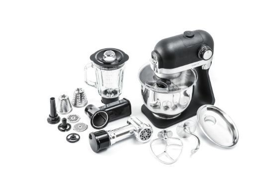 Мощность: 1200 Вт; Емкость чаши: 5,5 л; Кол-во скоростей: 5; Импульсный режим; Плавная регулировка скорости; Насадка-блендер; Мясорубка, кол-во дисков мясорубки: 3, насадка для кеббе, насадка для домашних колбасок; Насадка-овощерезка: 2 терки и 1 слайсер; Материал корпуса: металл; Прорезиненные ножки;