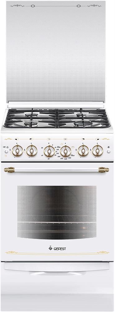 Габариты ШхГхВ: 50х58.5х85см; Ширина, см: 50; Цвет: белый, с рисунком "ретро"; Объем духовки, л: 52; Мощность горелки духовки, кВт: 3,1; Мощность гриль-горелки, кВт: 1,9; Варочная поверхность: эмалированная; Решетки стола чугунные; Крышка стола: стеклянная; Класс электробезопасности: I; Таймер механический; Газ-контроль духовки; Электророзжиг духовки: кнопка на панели; Электророзжиг горелок стола: кнопка на панели; Гриль: газовый; Вертел с электроприводом; ; Подсветка духовки; Направляющие духовки: съемные проволочные; Терморегулятор (термостат); Ящик для посуды и принадлежностей: выдвижной; Ножки регулировочные; Сетевой шнур и вилка: в наличии; Стекло дверцы духовки: двойное; Комплектность жаровня, накладка для посуды малого диаметра, противень, решетка духовки; Комплект сменных сопел