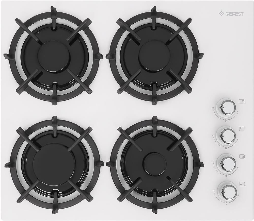 Габариты (ВхШхГ) 10х50х52,5см. 4 конфорки. Встроенный электророзжиг. Фиксированное положение «малое пламя». Система «газ-контроль». Варочная поверхность: стеклянная пластина белого цвета, чугунные решетки стола.