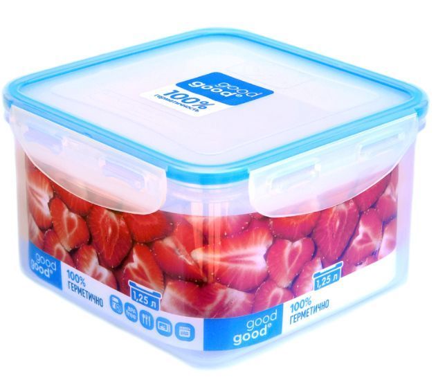 Контейнер пищевой герметичный объемом 1,25л (размер 155х155х90мм) Good&Good изготовлен из высококачественного полипропилена, который не содержит Бисфенол-А. Контейнер герметичный использует блокирующие клипсы с четырех сторон и силиконовый уплотнитель, что делает его 100% герметичным. Контейнер для СВЧ обеспечивает длительное сохранение свежести продуктов. Контейнер для еды Good&Good предназначен для хранения, заморозки и транспортировки различных продуктов, в том числе и жидкости. Пластиковый контейнер с крышкой можно использовать как ланч-бокс для дома, в офисе, в школе и на природе. Контейнер для хранения продуктов можно использовать в СВЧ Печи. Герметичный контейнер подходит для холодильных и морозильных камер. Пластиковый контейнер не деформируется при мытье в посудомоечной машине. Температурные режимы для использования в СВЧ, морозильной камере: +125 -24.