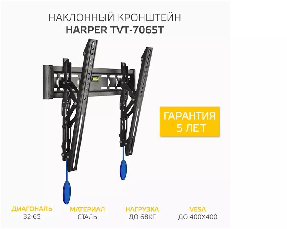 Предназначен для LCD и LED телевизоров с диагональю от 32 до 65 дюймов и весом до 68 кг. Крепление поддерживает стандарты VESA до 400x400, что обеспечивает универсальность и совместимость с многими моделями телевизоров. Регулируемый угол наклона от 0° до +12° позволяет достичь максимального комфорта при просмотре телевизора. А тонкий профиль (35 - 145 мм) делает кронштейн почти незаметным за Вашим ТВ. Раздельная конструкция, состоящая из настенной плиты и вертикальных направляющих с системой быстрой фиксации, обеспечивает простую сборку и удобную коммутацию кабелей. Для удобства монтажа кронштейн оснащен пузырьковым уровнем. Кронштейн HARPER TVT-7065T изготовлен из прочной холоднокатаной стали, что обеспечивает его надежность и долговечность. Назначение: для LCD- и LED-телевизоров Совместимость с диагональю ТВ: 32, 40, 42, 43, 50, 55, 60, 65 Тип кронштейна: наклонный Совместимость: поддерживает ТВ с диагональю 32-65 Максимальный вес ТВ: 68 кг