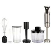 Блендер погружной, набор, максимальная мощность 1200 ватт, бесступенчатая регулировка скорости в одно касание, светодиодная подсветка, измельчитель 500 мл, мерный стакан 600 мл, венчик для взбивания, венчик для вспенивания молока, петля для подвешивания, длина кабеля 1,15 м.