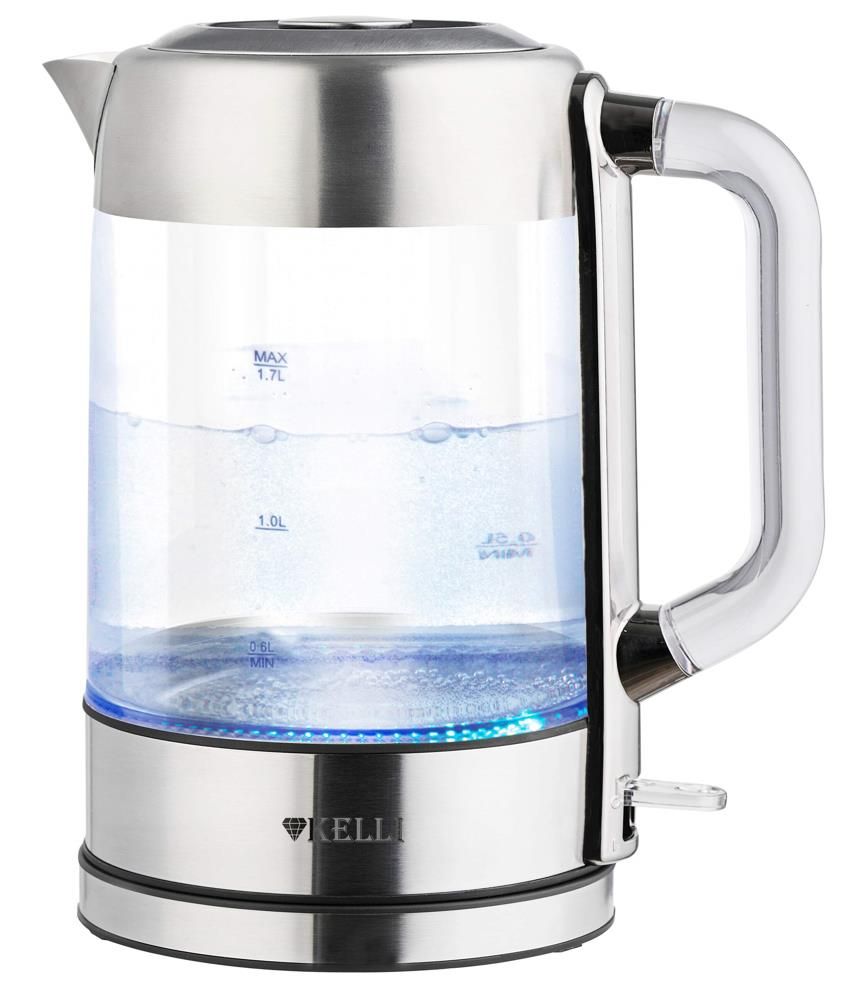 Cтеклянный чайник; Объем: 1.7 л; Мощность: 1850-2200 Вт; Термостойкое боросиликатное стекло; Внутренняя подсветка; Поворачивающийся корпус 360°; Автоматическое отключение; Шкала уровня воды; Эргономичная ручка; Удобный носик чайника; Защита от перегрева; Закрытый нагревательный элемент; Сеть: 220-240В, 50-60Гц