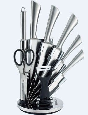 Набор кухонных ножей на подставке Высококачественная сталь 9 предметов: Топорик кухонный 16см, Нож поварской 20см, Нож хлебный 20см, Нож для резки 12см, Нож овощной 9см, Точилка, Ножницы Овощечистка с керамическим лезвием. Острая режущая кромка Легкая заточка Удобные ручки Восхитительный дизайн Практичная подставка