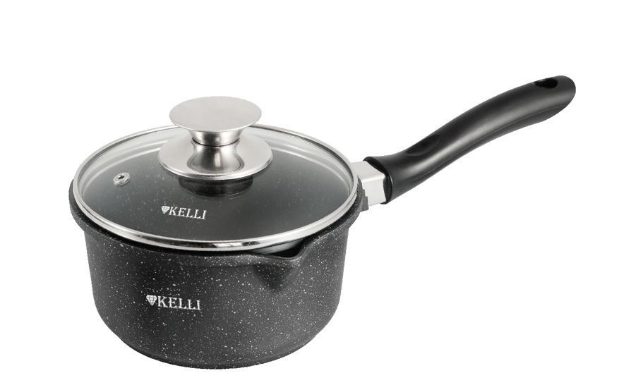 Ковшик с мраморным покрытием Объем: 1,6 л. Диаметр: 16 см. Индукционное дно. Материал: алюминий. Удобный сливной носик. Ручка с силиконовым покрытием. Жаропрочная стеклянная крышка с паровыпуском. Пригодна для всех видов плит.