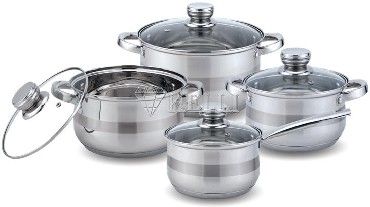Набор посуды из 8 предметов Кастрюля с крышкой 2,7 л Диаметр: 18 см Кастрюля с крышкой 3,7 л Диаметр: 20 см Кастрюля с крышкой 5,0 л Диаметр: 22 см Сотейник с крышкой 2,1 л Диаметр: 16 см Внутри кастрюль шкала измерения Высококачественная нержавеющая сталь 5-слойное капсульное дно. Зеркальная поверхность. Можно использовать на всех типах плит включая индукционную. Стеклянные крышки с паровыпуском. Удобные клепаные ручки не нагреваются. Посуда пригодна для мытья в посудомоечной машине.