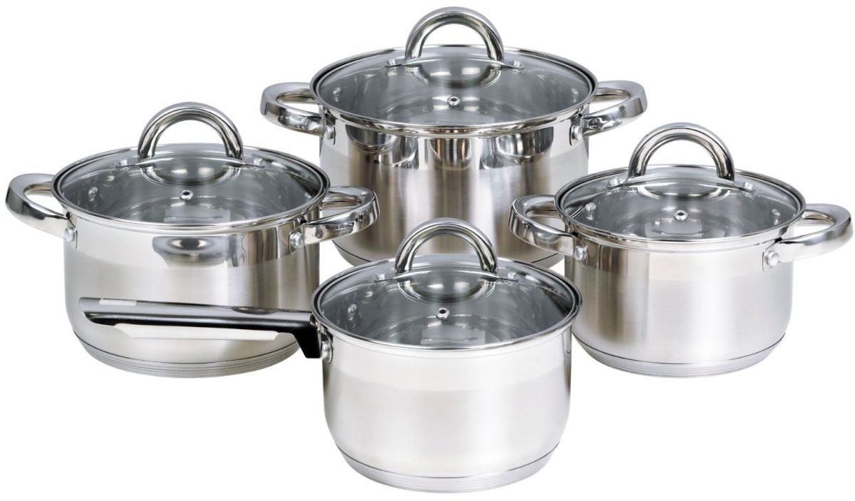 Набор из 8 предметов; Кастрюля с жаропрочной стеклянной крышкой 2.1л; Кастрюля с жаропрочной стеклянной крышкой 2.9л; Кастрюля с жаропрочной стеклянной крышкой 3.9л; Сотейник с жаропрочной стеклянной крышкой 2.1л; Высококачественная нержавеющая сталь; Капсульное дно; Удобные клепаные ручки; Жаропрочная стеклянная крышка с паровыпуском; Подходит для всех видов плит; Подходит для мытья в посудомоечной машине.