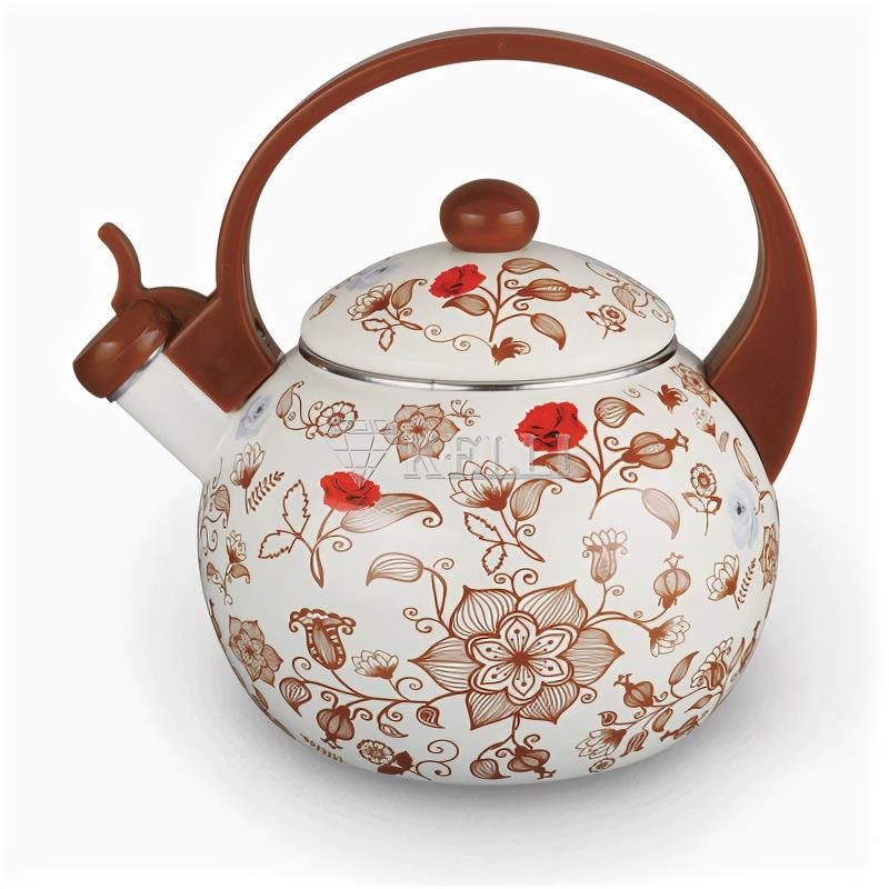 Эмалированный чайник со свистком Объем: 2,5л Носик со свистком и защитным кольцом Удобная ручка, не нагревается 3-х слойное внутреннее и внешнее эмалированое покрытие Неповсторимость дизайна Пригодность для посудомоечной машины Неповторимость узора