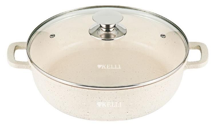 Сковорода-сотейник диаметром 28 см из высокопрочного алюминия с гранитным покрытием с индукционным дном Силиконовые накладки для ручек съемные. Стеклянная крышка с паровыпуском. Пригодна для всех видов плит, в том числе индукционных