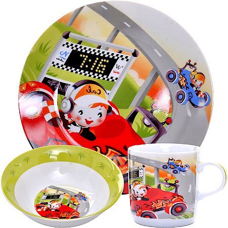 Предметы набора выполнены из высококачественной керамики и декорированы красочным рисунком. Изделия легкие и функциональные. Такой набор обязательно понравится вашему ребенку, потому что теперь у него будет своя собственная посуда с ярким и оригинальным детским рисунком. Набор посуды для детей включает в себя три предмета: суповую тарелку, обеденную тарелку и кружку. Набор упакован в красочную, подарочную упаковку. Подходит для мытья в посудомоечной машине. Для детей от 3-х лет.