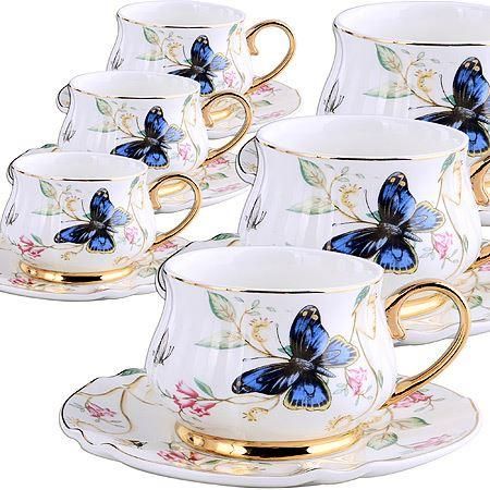 Чайный набор 12 пр LR (х6). Материал: костяной фарфор. Цвет: белый, синий, зеленый, желтый, золотая кайма Рисунок: Цветы, бабочки. D чашки 8,5 см, высота 6 см. Объем чашки: 200 мл. Диаметр блюдца: 15 см. Размер упаковки: 39 х 23 х 9,8 см. Упаковка: подарочная коробка. Вес: 2,100 кг. Страна производитель: Китай.