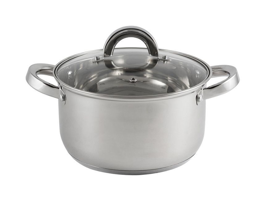 Кастрюля из нерж стали с крышкой, объем 5,8 л, размер: 24*13,5 см, серия "Mediano", тм Mallony Кастрюля из нерж стали с крышкой, 5,8 л 24*13,5 см размер, литраж 5,8 л, 201 нержавеющая сталь, толщина — 0,4 мм, дно 3-слойное капсулированное — нерж сталь 201 + 1 мм алюминия + 430 сталь (толщина дна — 1,7 мм), подходит для индукции, снаружи и внутри — зеркальная полировка, полые ручки из нерж стали, С-тип крышка из жаропрочного стекла с отверстием для выпуска пара. Отметки литража. Упаковка — цветной картонный вкладыш, термоусадка (крышка в перевернутом виде внурь кастрюли). Не рекомендуется мыть в посудомоечной машине. Метод производства — штампованная. Тип крепления ручек — заклепочное. Подходит для всех типов плит.
