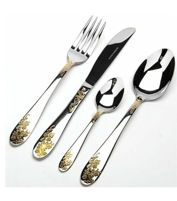 Набор столовых приборов MAYER&BOCH на 6 персон включает в себя 18 предметов: 6 столовых ложек, 6 столовых вилок, 6 чайных ложек. Столовые приборы изготавливаются из высококачественной нержавеющей стали, все изделия проходят тщательный технологический контроль. Приборы из нержавеющей стали такого состава отличаются высокими антикоррозионными свойствами, значительной устойчивостью к воздействию кислот и щелочей. Такая сталь не изменяет вкус и цвет пищи, не выделяет вредных веществ. Элегантные золотые узоры на столовых приборах выполнены по технологии плазменного напыления, обеспечивающего высокую износостойкость покрытия. Стильный, классический дизайн и отличное качество столовых приборов MAYER&BOCH делают набор желанной покупкой для любого, даже самого пристрастного, клиента. Набор столовых приборов MAYER&BOCH, безусловно, займет достойное место на любой кухне. Набор подходит как для ежедневного использования, так и для торжественных случаев. Набор упакован в красивый подарочный деревянный кейс. Подходит для м