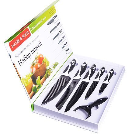 Набор ножей MAYER&BOCH с лезвиями из высококачественной нержавеющей стали станет незаменимым помощником на вашей кухне. Лезвия покрыты специальным антибактериальным Non-Stick покрытием, предотвращающим прилипание продуктов к лезвию ножа и обеспечивающим свежесть и гигиеничность продуктов при их нарезке. Поверхность клинков легко моется, не впитывает и не «передает» запахи пищи при параллельной нарезке различных продуктов. Набор ножей идеально подойдет для резки как мяса и рыбы, так и фруктов и овощей. При помощи керамического ножа-пиллера вы быстро и тонко сможете очистить овощи. Эргономичная рукоятка каждого изделия удобно ложится в ладонь, обеспечивая безопасную работу, комфортное положение в руке, надежный захват и не дает ножам скользить при использовании. Яркий дизайн изделий украсит вашу кухню, а благодаря красивой упаковке, такой набор станет еще и прекрасным подарком! В набор входит 5 ножей и керамический нож-пиллер.