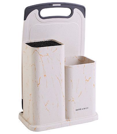 Универсальная подставка Mayer&Boch позволит хранить ножи и ножницы любой формы, вне зависимости от их формы и лезвия. Корпус подставки выполнен из пластика, что делаетт её гигиеничной и долговечной, покрыт нескользящим слоем soft-touch. Уникальный внутренний наполнитель состоит из тонких и гибких полипропиленовых стержней, которые легко моются. При необходимости наполнитель свободно вынимается и моется в посудомоечной машине. Полипропилен является экологически чистым материалом, устойчивым к истиранию, высокой температуре и химическому воздействию.Имеет два отсека: для ножей и столовых приборов, а так же в наборе разделочная доска. Подставка для ножей MAYER&BOCH станет прекрасным подарком, а ее яркий дизайн станет украшением Вашей кухни.