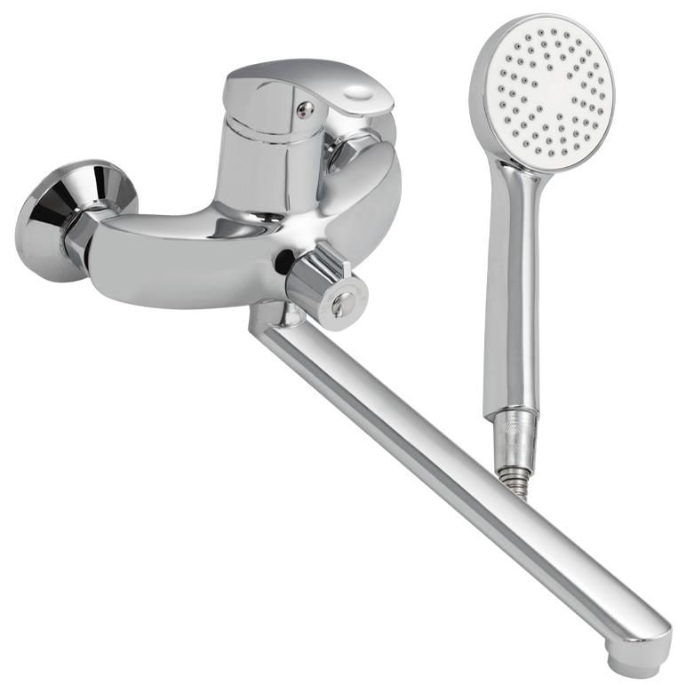 Смеситель хромированный в ванную / душевую комнату с длинным, плоским изливом, изогнутый дутый корпус, шаровый, с дивертором м/к на корпусе. Материал изготовления — ЦАМ (цинк-алюминий-медь) + нержавеющая сталь. Картридж d = 40 мм, ручка литая, аэратор для экономии воды, чашки и эксцентрики. Габаритные размеры: ширина 150 мм, высота корпуса 155 мм, длина излива 280 мм, трёхрежимная душевая лейка d = 78 мм, шланг 150 см. Вес - 1,500 кг, объём - 0,00435 м3. В комплекте паспорт, корпус с изливом, дивертор, душевая лейка, шланг, кронштейн, комплект крепежа и прокладок.