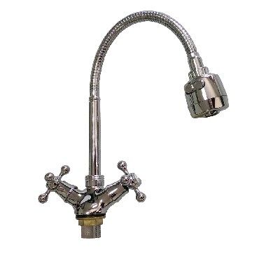Смеситель для кухонной мойки и раковин, массивный корпус с гибким изливом, хромированный, с двухрежимным аэратором для экономии воды. Материал изготовления — ЦАМ (цинк-алюминий-медь) + нержавеющая сталь. Крепление резьба - гайка. Кранбукса м/к 1/2, ручка крест, поворот на 90?. Габаритные размеры: высота 280 - 340 мм, длина 180 - 230 мм, диаметр посадочного седла 45 мм, длина резьбы 35 мм, длина подводки 350 мм. Вес - 1,100 кг, объём - 0,00317 м3. В комплекте корпус с изливом, паспорт, подводка 1/2, крепёж.
