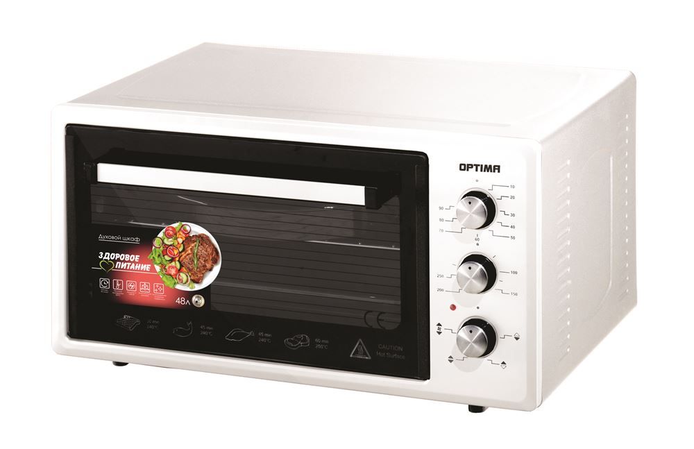 Гарантийный срок: 2 года; Гриль: есть; Количество режимов: 3; Лампа: есть 15Вт; Макс. температура нагрева, °С: 300; Мощность (Вт): 1600 Вт; Напряжение (В): 230; Объем (л): 48 л; Противень: есть; Противень круглый: есть; Решетка: есть; Таймер: есть, 90 мин.; Термостат: 50-300 *С; Цвет: белый; Частота (Гц): 50; Часы/таймер: нет/90 мин.; Духовка электрическая OPTIMA OF-48W довольно проста в использовании и управлении. При этом она позволит вам готовить различные мясные и рыбные блюда, запеканки, выпечку. Электропечь имеет достаточно вместительную внутреннюю камеру (48 литров), что дает возможность готовить в ней блюда на большую семью или для гостей. Два нагревательных элемента (общей мощностью 1600Вт) обеспечивают быстрый и равномерный нагрев от 50 до 300 градусов. OPTIMA OF-48W оснащена таймером с функцией автоотключения через 90 минут, что несомненно добавляет удобства в использовании данной модели. Качественная теплоизоляция корпуса обеспечивает безопасность и исключает вероятность ожога при прикосновении. Встроенная лампа улучшает обзор и позволяет готовить с комфортом. В комплект входят решетка, круглый и квадратный противни, которые можно одновременно разместить на двух разных уровнях для приготовления блюд.