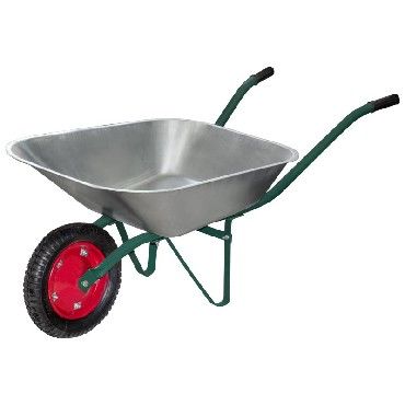 Тачка садовая WB 4307 в т/у. Грузоподъемность 130кг, корыто оцинкованное объем 65л, толщина 0,6мм, колесо пневматическое d 330мм, рама d 32мм трубы, толщина трубы 1,4мм, упакована в термоусадку.