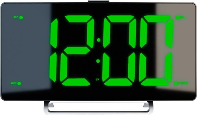 Светодиодный дисплей с высотой символов 3" (7.62 см) Плавная регулировка яркости дисплея Кварцевый стабилизатор Два будильника Два режима работы будильника (сигнал/радио) Отложенный сигнал будильника Отключение радио по таймеру Формат времени 12/24 часа FM-тюнер (87.5 – 108 МГц) Встроенный динамик Два USB-порта для зарядки мобильных устройств (5 В 1 А) Питание от адаптера (в комплекте) Индикация: зеленая Цвет: чёрный