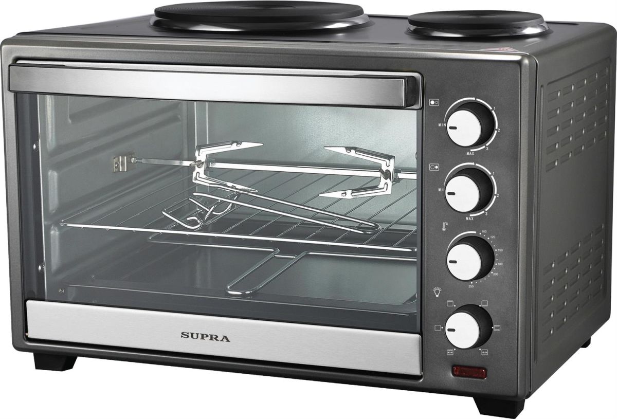 Электрическая печь с грилем и конфорками, объем: 35 л, потребляемая мощность: 1850 Вт, механическое управление, гриль, электрический гриль, температура: 100-250°С, внутренняя подсветка, 6 режимов нагрева, индикация включения, комплектация: металлическая решетка, плоский противень, насадка для шашлыка/кебаба, ухват для противня, вертел, ухват для вертела