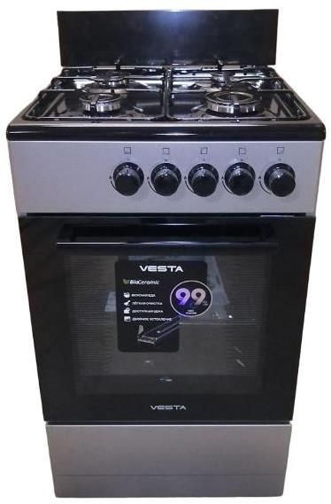 Горелки стола: Газовые – 4 шт.Мощность горелок рабочего стола: -Горелка передняя левая/правая – 2,0/2,4 кВт. -Горелка задняя левая/правая – 2,0/1,0 кВт. -Мощность горелки духовки – 2,5 кВт. Объем духовки в литрах: 65 л. Нижний/верхний нагреватель духовки – газ. Газ-контроль духовки. Решетка рабочего стола – сталь. Щиток. Элементы комфортности: Термометр духовки. Противень – 1 шт. Масса нетто/брутто – 36/40 кг.