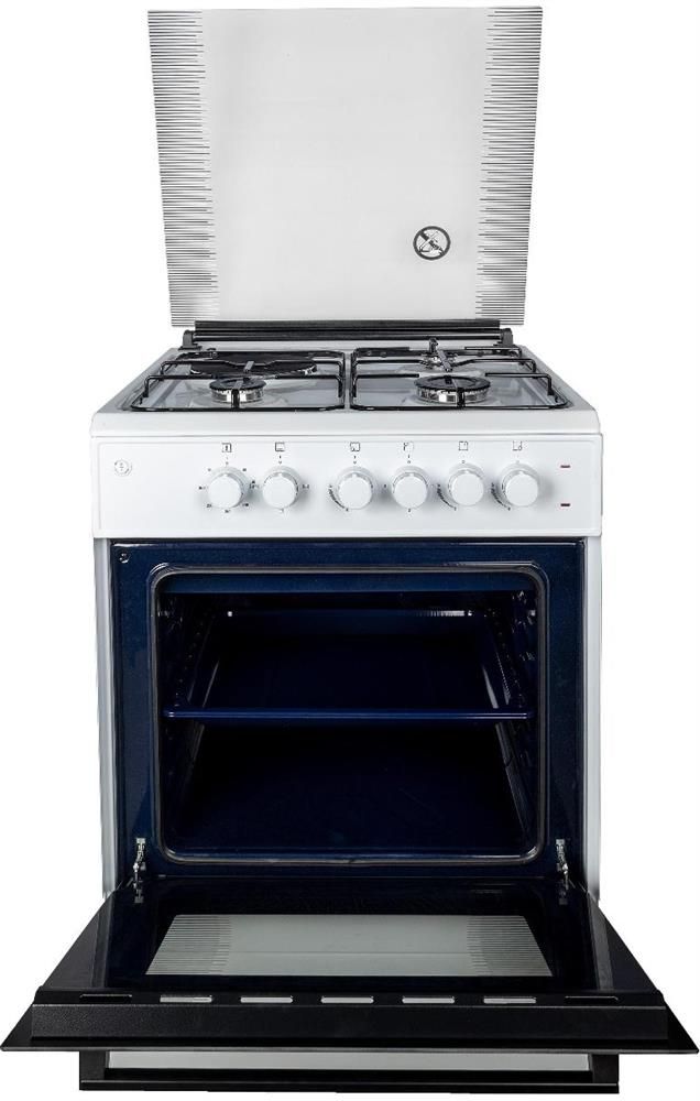 Габариты: (ШхВхГ) см - 60х85х60. Горелки стола: Газовые 3 шт. Электр. 1 шт. Мощность горелок рабочего стола: -Горелка передняя левая/правая 2,0/2,4 кВт. Горелка задняя левая, электрическая 1,5 кВт. Горелка задняя правая 1,0 кВт. Решетка рабочего стола сталь. Крышка рабочего стола стекло. Верхний нагреватель духовки ТЭН. Нижний нагреватель духовки ТЭН. Электророзжиг при помощи кнопки. Электрическая подсветка духовки. Термостат, Индикатор работы электроконфорок. Индикатор работы ТЭНа духовки. Противень 2 шт. Цвет Белый.