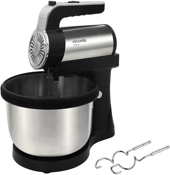 Миксер Viconte VC-1343 1000 W, Миксер с чашей, 1000 W, 5 скоростей работы, металлическая вращающаяся чаша 4,0 л для смешивания, кнопка извлечения насадок, двойной набор насадок: два венчика для взбивания яиц и кремов, две насадки для размешивания тяжелого теста, смешивание жидкостей, замешивание теста, приготовление пюре, взбивание сливок и белков.