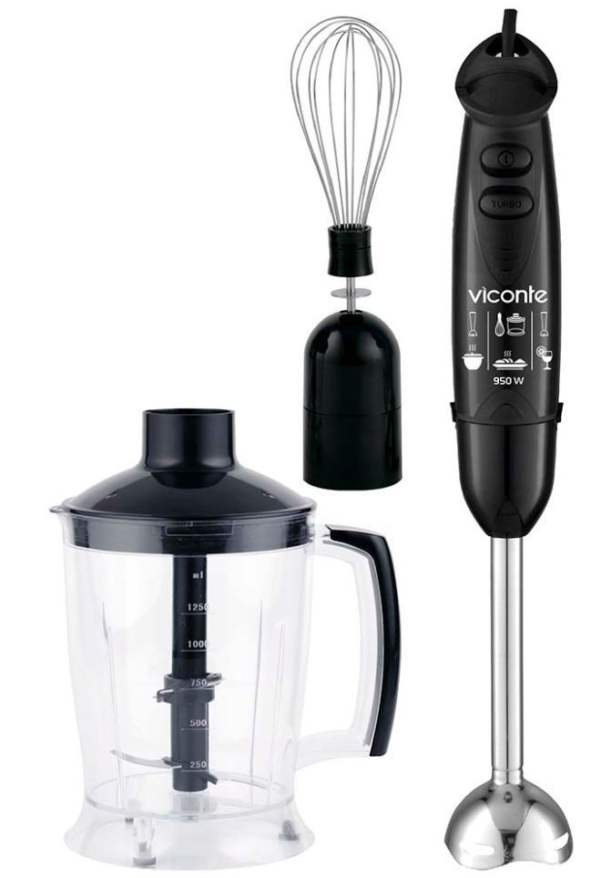 Погружной блендер, мощность 950W, пульсовый режим работы, 2 скорости, металлическая нога блендера, венчик для взбивания, чаша объемом 1250 мл с ножом из 4 лезвий для рубки и измельчения, автоматическая блокировка при неправильно установленной насадке.