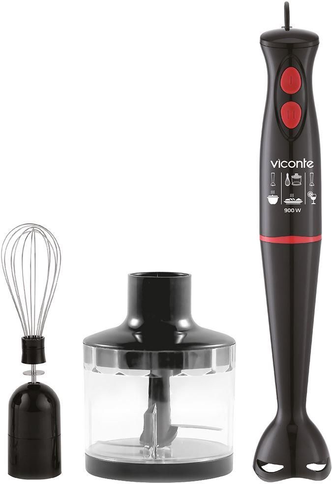 Погружной блендер Viconte VC-4448 900 W, Погружной блендер, мощность 900 W, современный эргономичный дизайн, пульсовый режим работы, 2 скорости, лезвия из нержавеющей стали, пластиковая нога блендера, венчик для взбивания, чаша с ножом для рубки и измельчения, 500 мл; автоматическая блокировка при неправильно установленной насадке, удобство и простота в обращении и чистке.