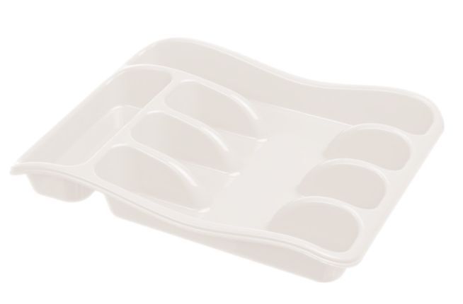 ЦВЕТ: белый. РАЗМЕР ИЗДЕЛИЯ: 258 x 330 x 54 мм. МАТЕРИАЛ: Полипропилен. Изделие из пищевого пластика для компактного хранения столовых приборов. Разделители в лотке позволят содержать в порядке весь столовый набор и без труда находить нужный предмет кухонной утвари. Габариты лотка оптимальны для его размещения в кухонных ящиках самых распространенных вариантов по ширине и глубине.