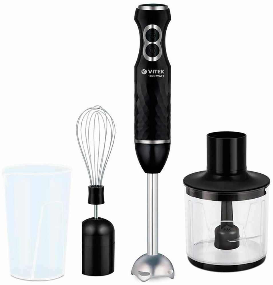 Блендер погружной. Мощность: 1000 вт, Количество скоростей: 2, Турборежим, Управление: механическое, Материал корпуса: пластик, Материал погружной части: нержавеющая сталь, Емкость измельчителя: 300 мл, Емкость мерного стакана: 600 мл, Венчик для взбивания, Мерный стакан, Длина сетевого шнура: 110см, Измельчитель, Цвет: Черный
