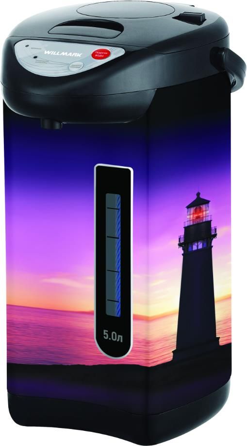 Чайник-термос WILLMARK WAP-705IS бытовой электрический прибор, сочетающий в себе функции электрочайника и термоса. На данной модели установлен нижний нагревательный элемент мощностью 900 Ватт, который несомненно увеличит срок службы поттера. Прибор обладает увеличенным сроком гарантии, который составляет 2 года! Температура кипячения 100 градусов Цельсия, поддержание температуры 85 градусов Цельсия. Внешний корпус с оригинальным стильным рисунком выполнен из чёрного пластика и нержавеющей стали. На передней панели установлена стильная шкала с минимальными и максимальными обозначениями уровня воды в приборе. Ёмкость для нагрева воды из нержавеющей стали объемом 6,0 литров. В верхней части корпуса расположена крышка с отверстием для выпуска пара при кипячении, а также хромированная оригинального дизайна кнопка, нажатием на которую открывается сама крышка. Сама крышка съёмная, для удобства чистки прибора. Чайник-термос снабжён пластиковой ручкой для удобства переноса. На верхней части прибора расположена и п