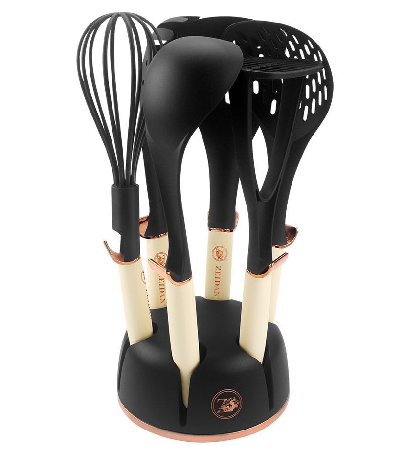 ZEIDAN Z-2066 Кухонный набор ZEIDAN Z-2066 7 предметов, Кухонный набор 7пр. ВЫСОКОКАЧЕСТВЕННЫЙ ЖАРОПРОЧНЫЙ НЕЙЛОН, подставка, лопатка с прорезями, шумовка, половник, картофелемялка, ложка для спагетти, венчик для взбивания, ручки soft-touch с декоративным элементом "под золото" . Подарочная упаковка с пластиковой ручкой.